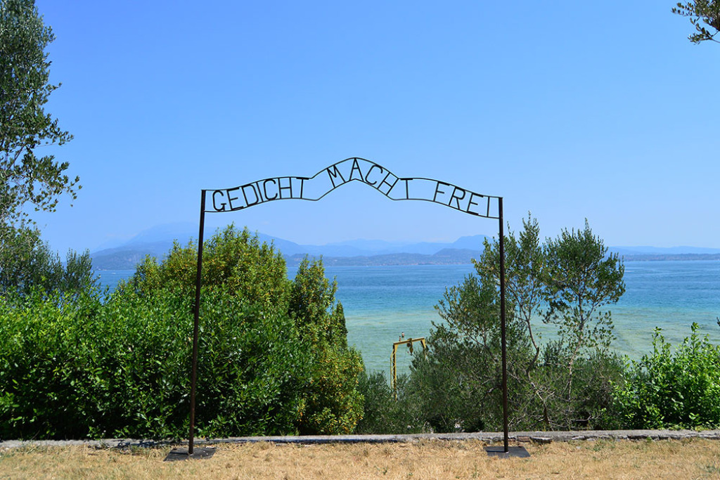 Jak się okazało od 10 lipca w Sirmione odbywa się ,, CiboMente”. Dni kultury mające na celu w odpowiedni sposób oddziaływać na nasze bodźce. Ja jako nieświadoma osoba, tego co miał nam przekazać napis ,,Gedicht macht frei” odebrałam to jako kpinę i żart. Źle się poczułam w tym miejscu. Napis ten miał nam przekazać, że praca powinna być poezją, przyjemna i delikatna. Idziemy dalej. Przechodzimy pod tą niby bramą i zastanawiamy się, co nas jeszcze dziś czeka. Za parkiem widać przeźroczystą wodę Gardy, góry i plażę.